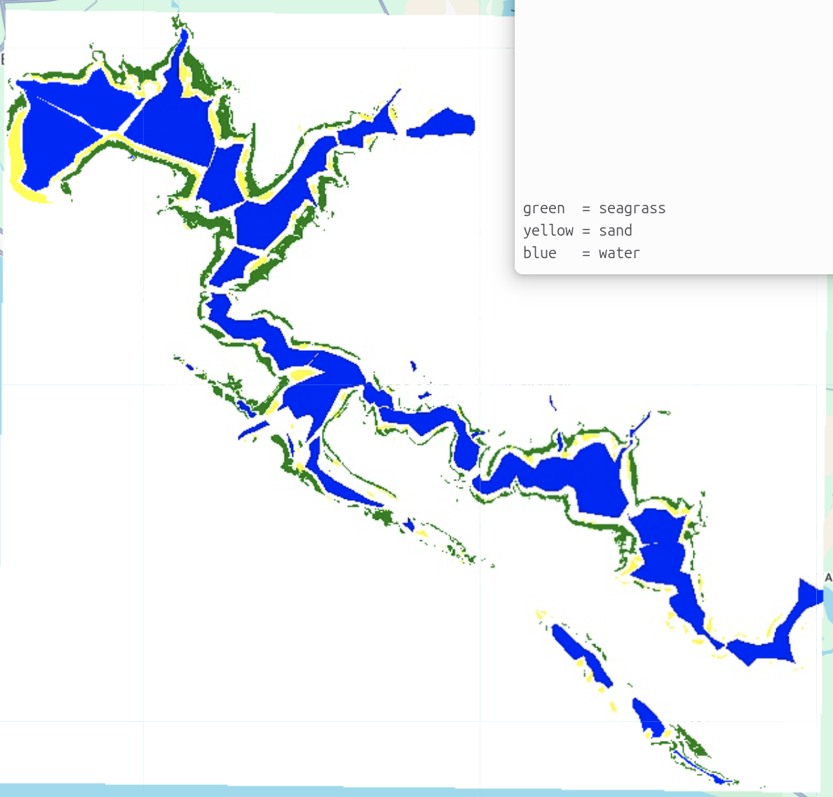 Note that this image shows actual cover of seagrass and example locations of water and sand; all sand&&water is not marked. For this application completeness matters far less than correctness.